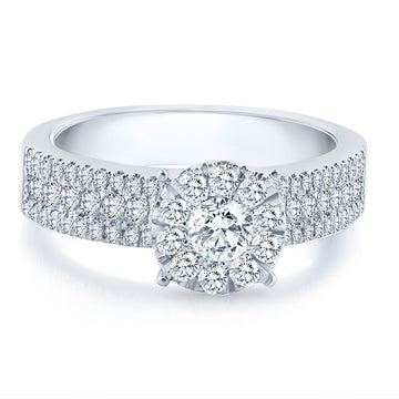 The rows of pavé diamonds and bright-cut border of this ring emanate the rays of...