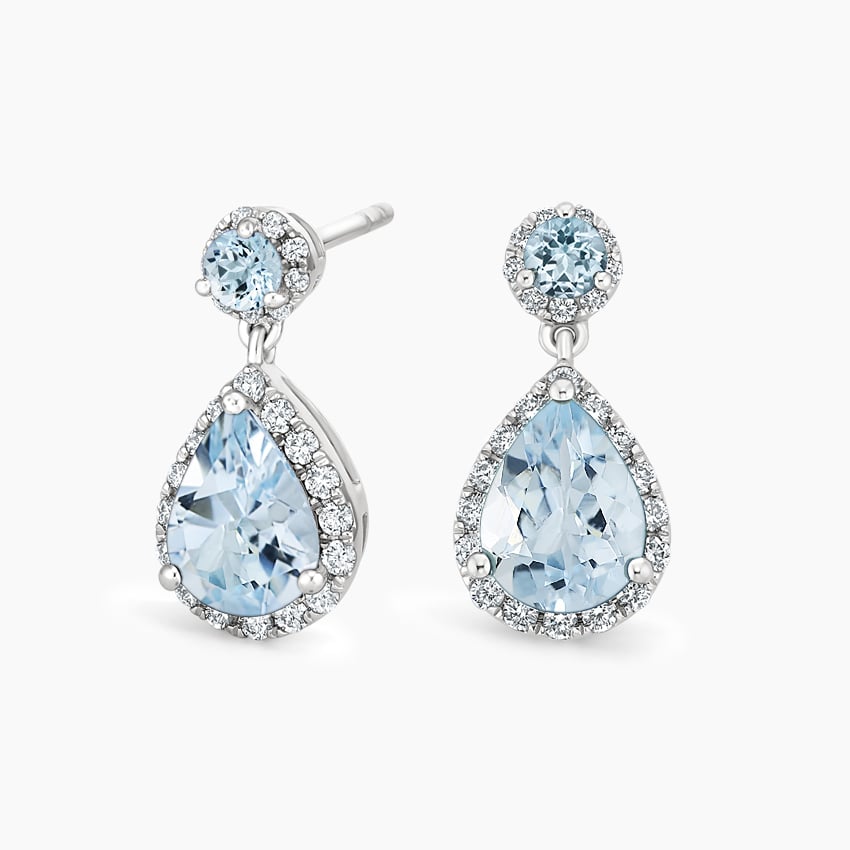 Two glittering halos showcase the enchanting beauty of round and pear-shaped aquamarines in a timeless...