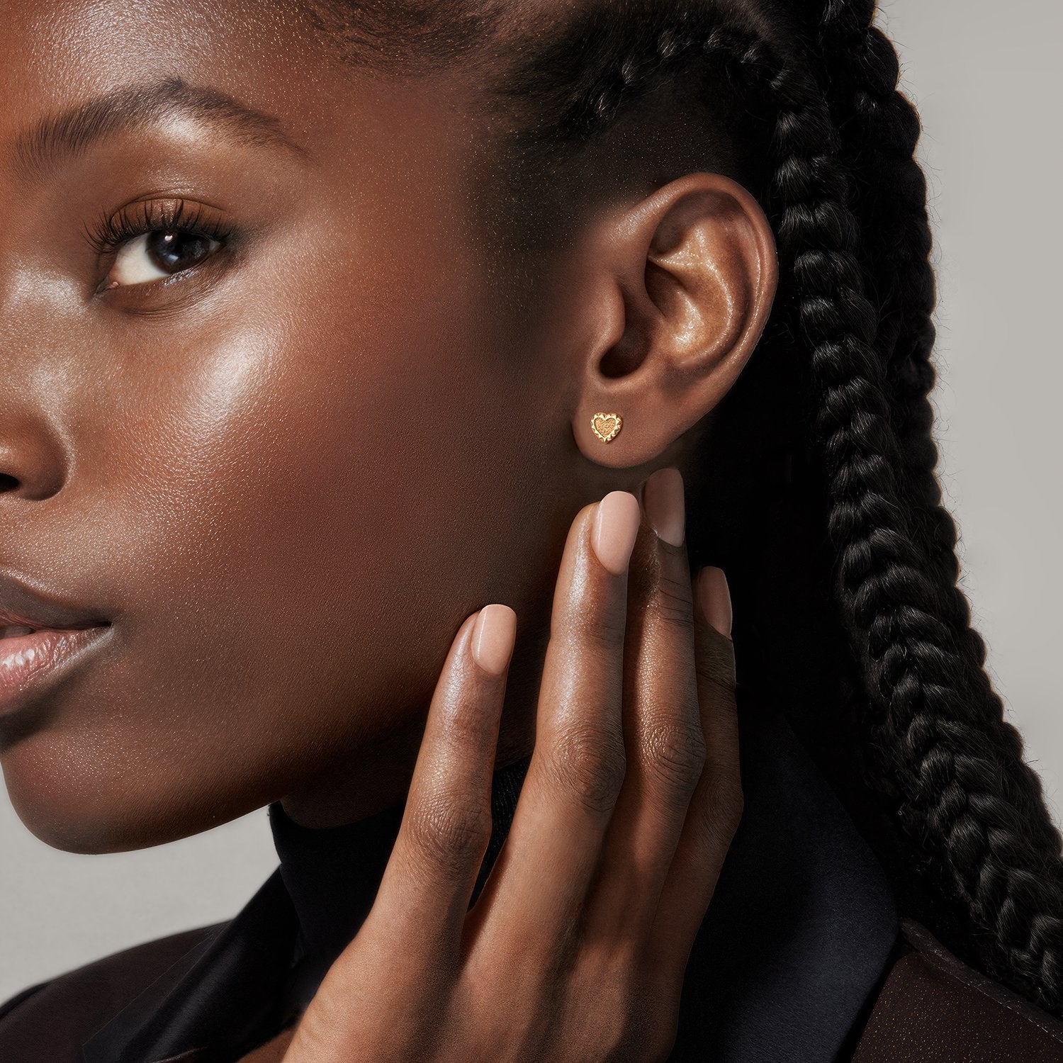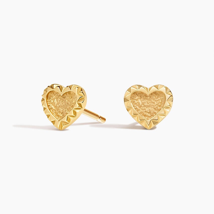 These heart-shaped stud earrings feature our signature bright-cut border and a unique texture that catches the light. Wear them on their own or stack them up with other styles.