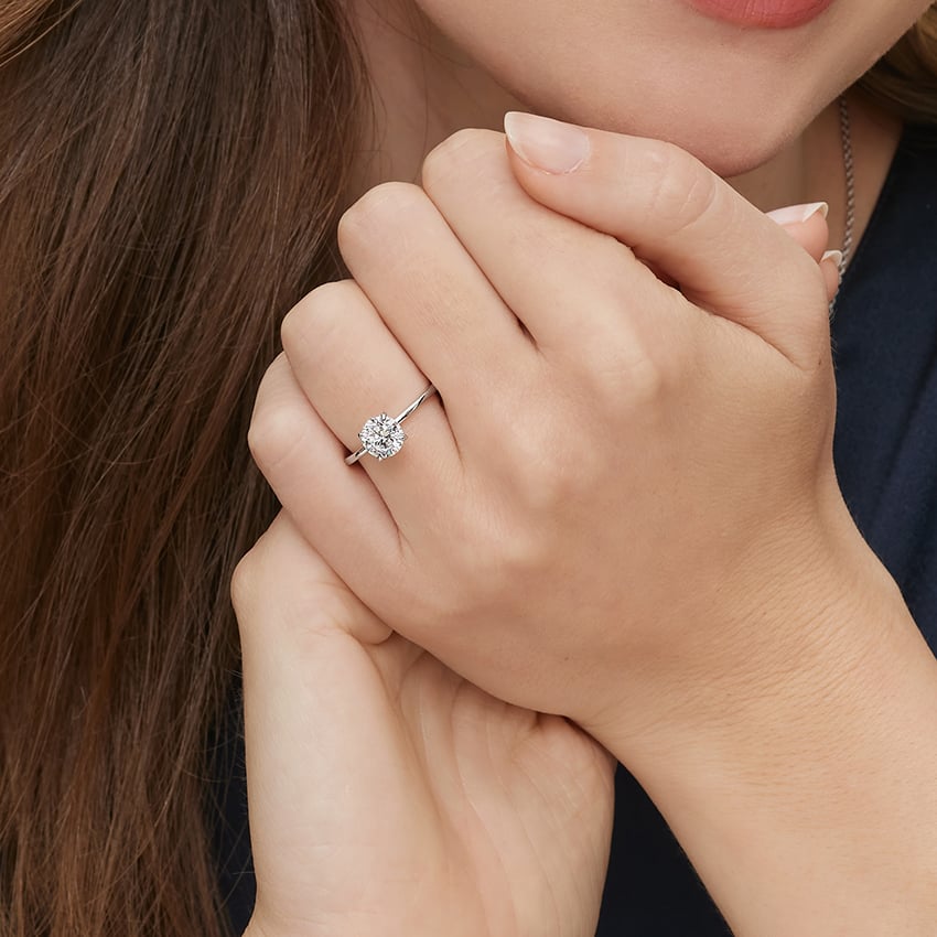 An ultra thin shank gives way to a hidden halo of diamonds that wrap around the base of this ring for a romantic, on-trend look.