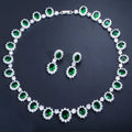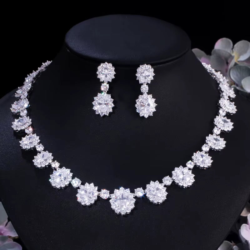 This elegant set includes a radiant necklace and a pair of earrings, all adorned with high-quality cubic zirconia and crafted with exquisite attention to detail.